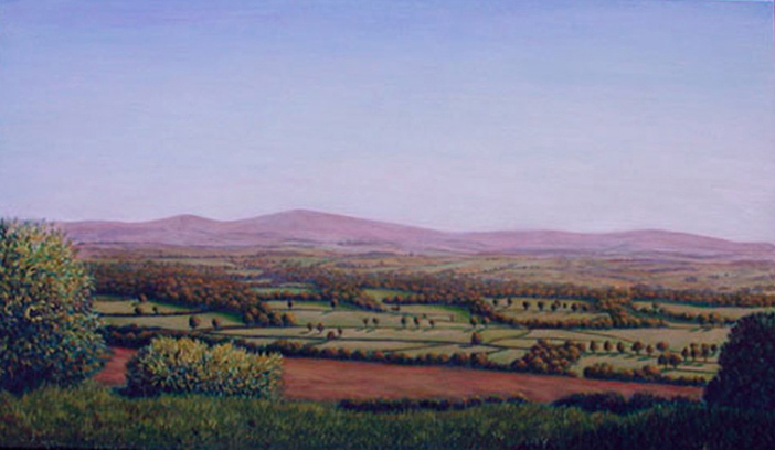 A blimp was flown on Saturday June 14 2014 to show the height of the proposed turbine. This photograph, taken from Hatherleigh Moor, at the same viewpoint as the painting above, but looking a little more eastwards, shows how much this one large turbine will impact on one of the most stunning views in the whole of Devon. The blimp is visible on the skyline, at the highest point of the facing Dartmoor hill. |